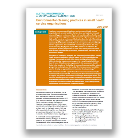 To assist business owners and health related professionals understand and fulfil their responsibilities regarding environmental cleaning, The Commission has released a number of resources that clarify steps towards ensuring optimal environmental cleaning, including a 2021 version of their Environmental Cleaning Practices for Small Health Service Organisations.